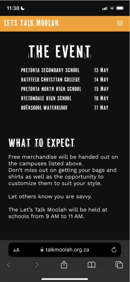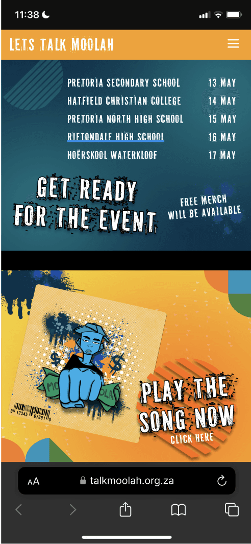 The "Let's Talk Moola" project addressed the lack of practical financial literacy education within South Africa’s high school Life Orientation (LO) curriculum. This project seeked to fill that gap, targeting students aged 14-18 by introducing accessible, interactive methods for learning fundamental financial principles. We wanted to break down stigmas around discussing finances and to encourage young South Africans to engage openly with concepts like budgeting, investing, and responsible spending..