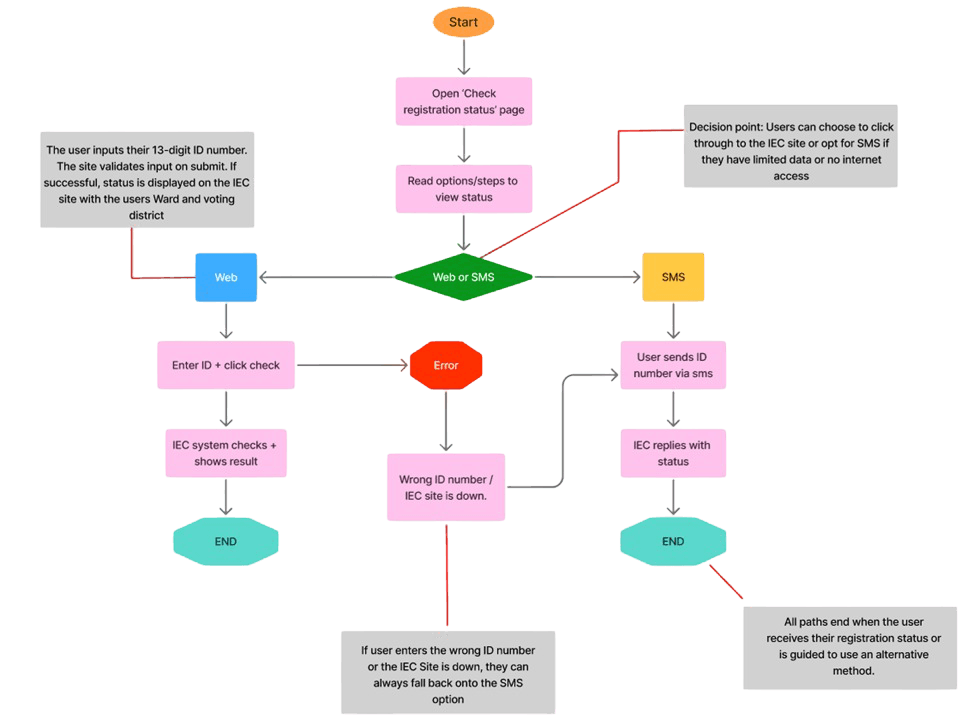 The user flow focuses on a key task — specifically the registering and checking registration status page.
