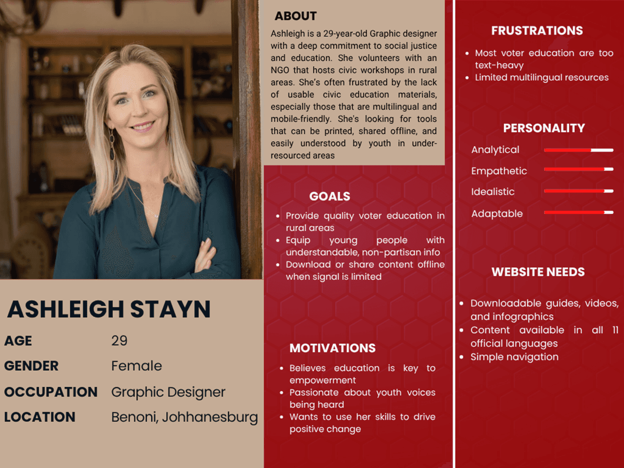 This project focused on designing a mobile voter education platform for South African youth. The goal was to create a clear, impartial, and accessible space where young people can learn about registration, the voting process, and their rights, while encouraging participation in future elections.