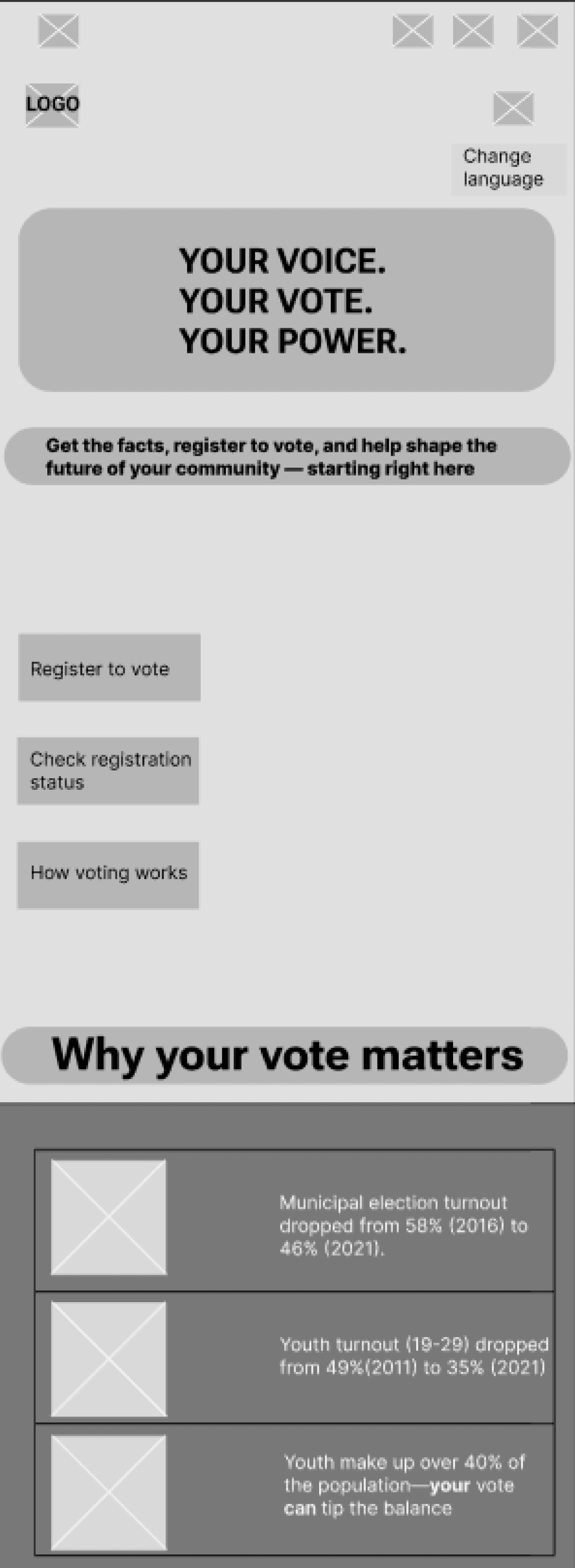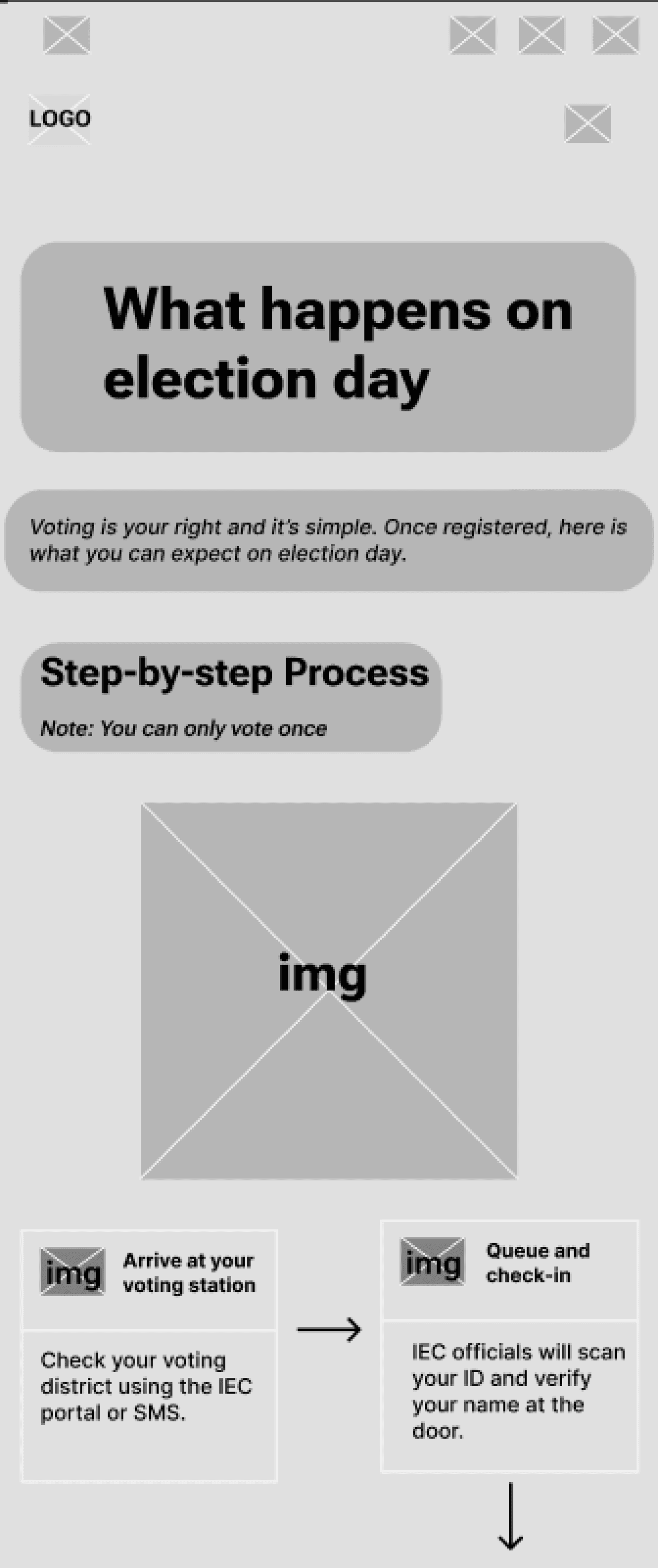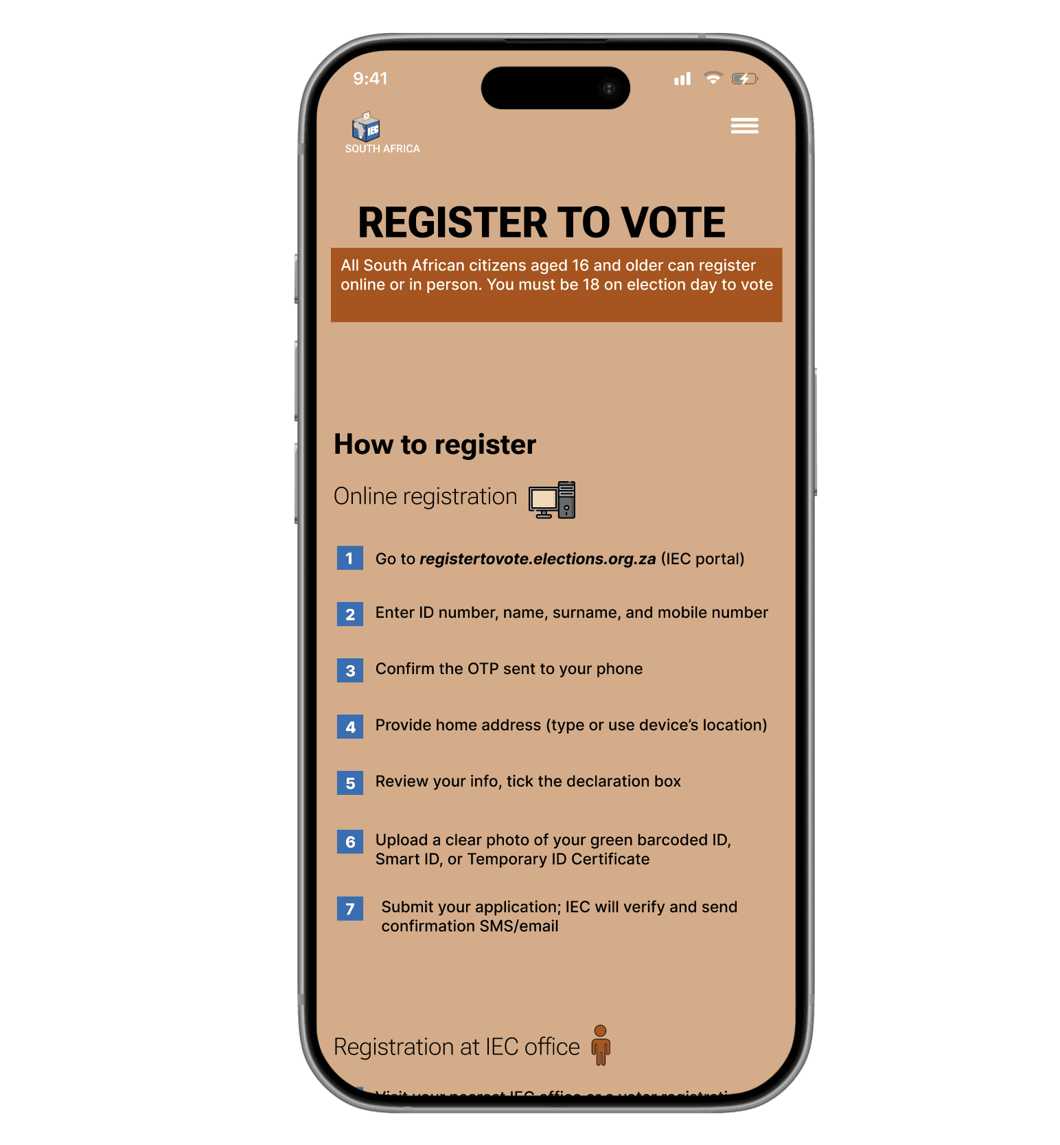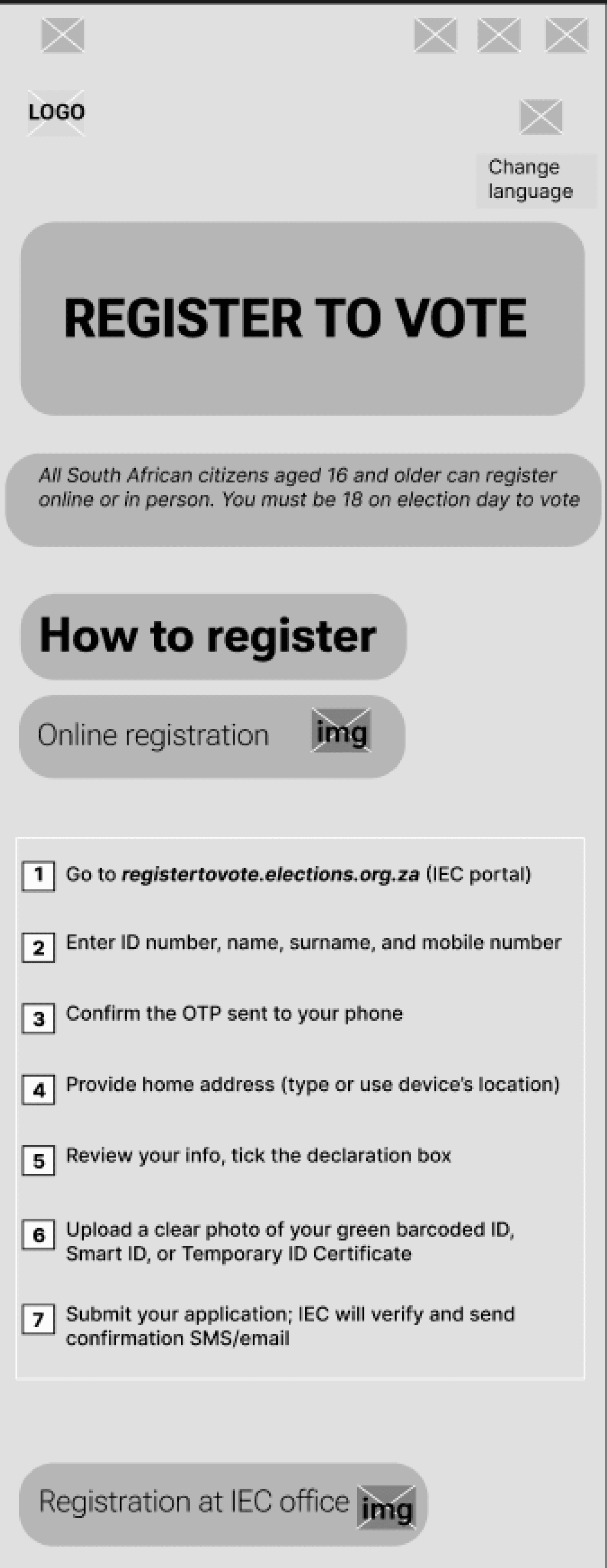 This project focused on designing a mobile voter education platform for South African youth. With turnout among 18–29 year-olds below 20%, the goal was to create a clear, impartial, and accessible space where young people can learn about registration, the voting process, and their rights—while encouraging greater participation in future elections.